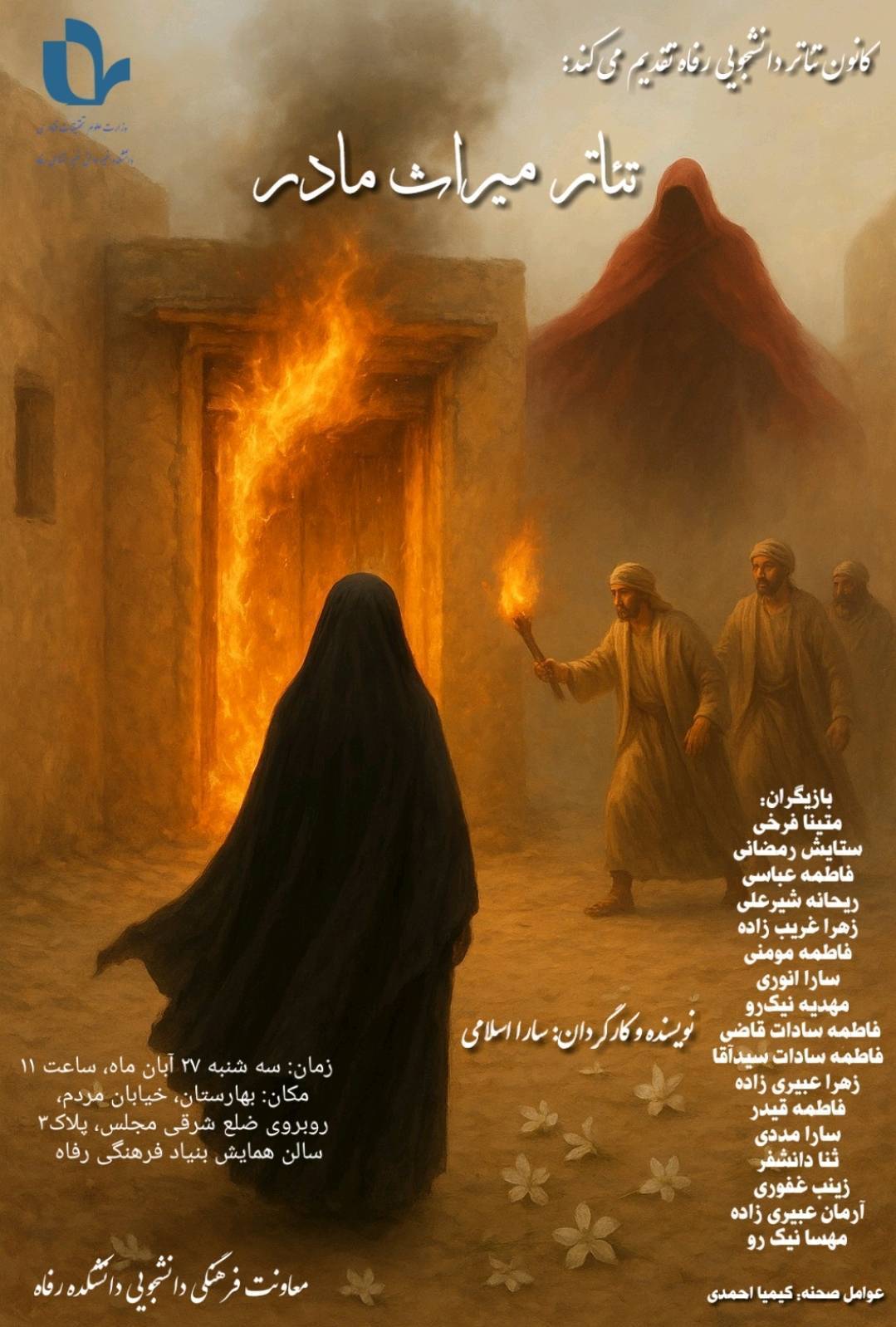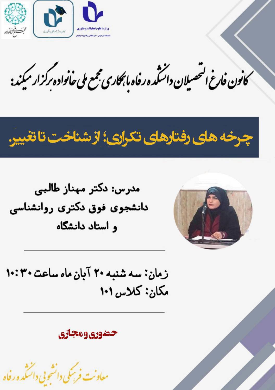 سرپرست کانون تئاتر دانشکده رفاه، در پایان ضمن تشکر از همراهی آقای دکتر باهنر رئیس هیات امنای دانشکده، خانم دکتر طاهری پور ریاست دانشکده، خانم دکتر حنیفه زاده معاونت فرهنگی دانشجویی دانشکده و سایر همکاران همراه، خبر از اجرای ویژه ایام شهادت حضرت زهرا(س) با تلفیقی از وقایع جنگ ۱۲ روزه داد.