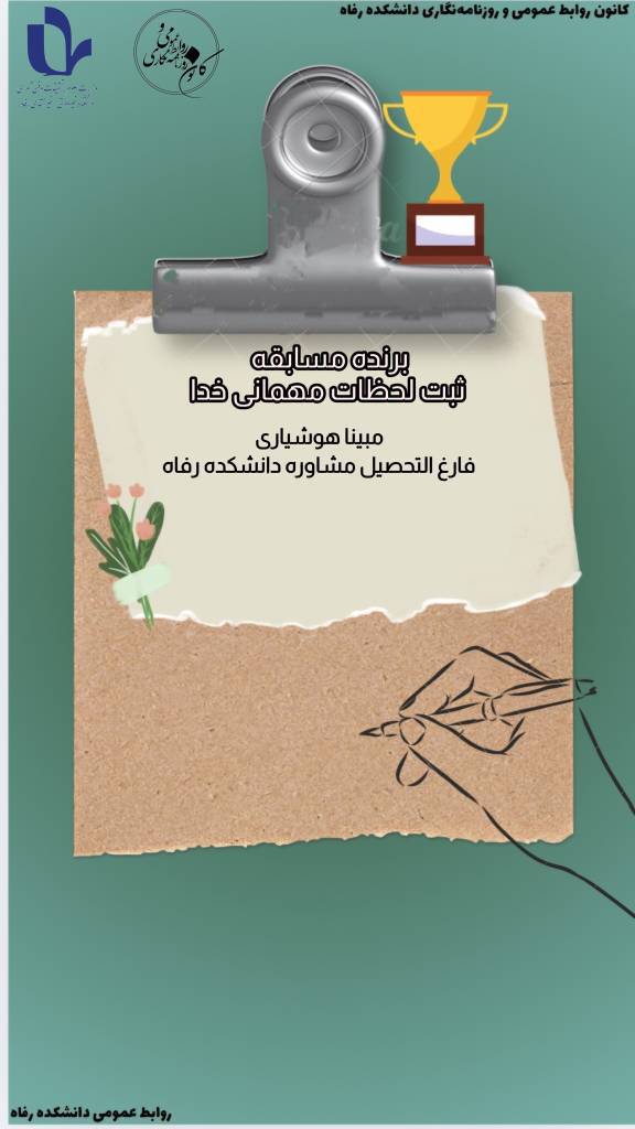 با کمال افتخار به اطلاع میرسانیم مبینا هوشیاری فارغ التحصیل مشاوره دانشکده رفاه به عنوان برنده این مسابقه انتخاب شد. اثر او با عمق احساس و زیبایی کلام، مورد توجه داوران قرار گرفت.